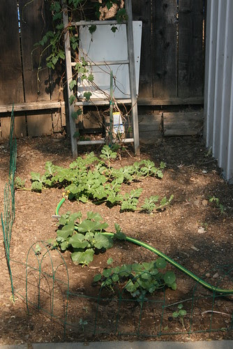This is my little melon patch. Apparently, the words "little" and "melon patch" don't really go together as these vining plants really like some room to spread out. But, this is where they are...hopefully they'll "bloom where they're planted"!